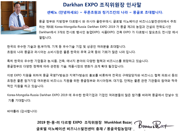 ▣ DARKHAN EXPO 조직위원회 총재 강동구 초대 인사말