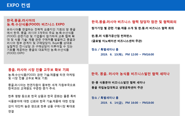 한,몽,러 3개국의 정부 및 기관들이 지원 하는 EXPO 행사로 관련Buyer 및 참관객의 확대는 물론 국영TV방송, 종합TV방송 홍보 등으로 EXPO 행사의 시너지효과가 클것으로 기대됩니다.