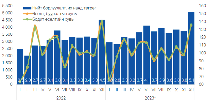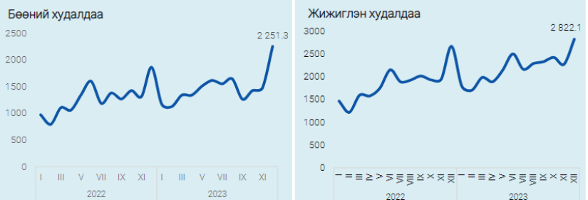 같은 해 11월 대비 2023년 12월 무역 부문 매출이 증가한 것은 주로 자동차 부품 판매가 1,648억 MNT 증가하고 연료 도매 판매가 2,106억 MNT 증가했기 때문입니다. .