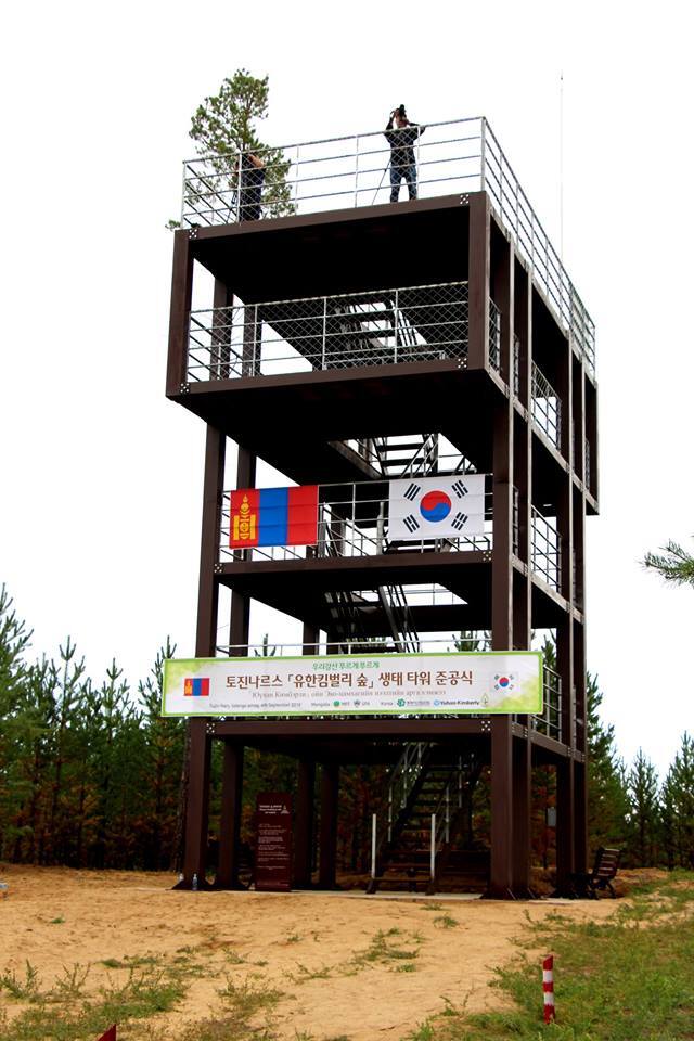 Selenge 지방의 Tuji 소나무 특별 보호 구역 에 있는 인공 소나무 숲 에 이 타워가 가동된 지 어느 정도 시간이 지났습니다 .