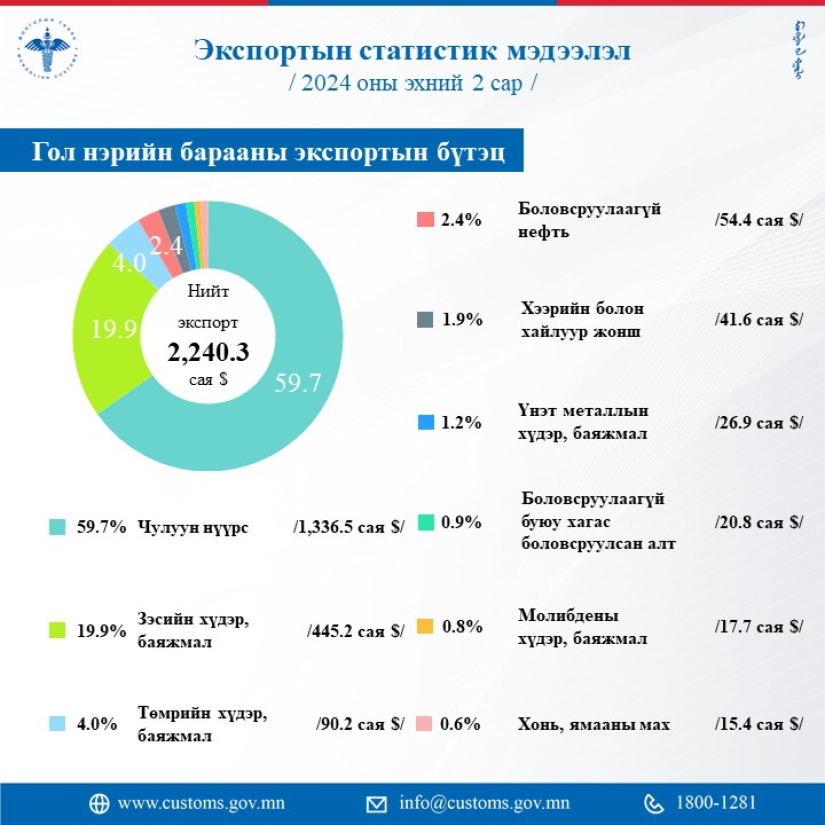 올해 첫 2개월 동안 수출된 납광석 , 정광, 철광석, 구리, 아연 정광, 원유, 석탄 은 100 % 중국으로 수출 되었으며 , 가공된 소 가죽 과 말가죽은 BNTU로 100 % 수출 되었으며 , 코밍 캐시미어의 82.1%는 이탈리아로 수출되고 , 워싱 염소 캐시미어 의 99.9%는 중국으로 수출되며 , 상기 제품이 전체 수출액의 87.2%를 차지합니다.